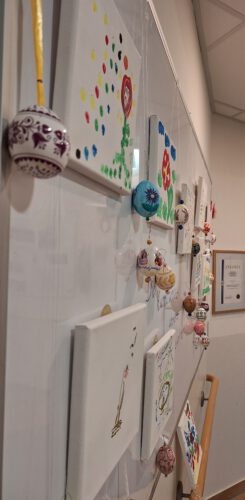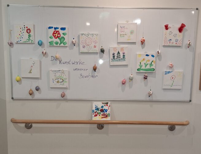 Die Bewohner stellen ihre ersten Kunstwerke aus der Malgruppe aus.